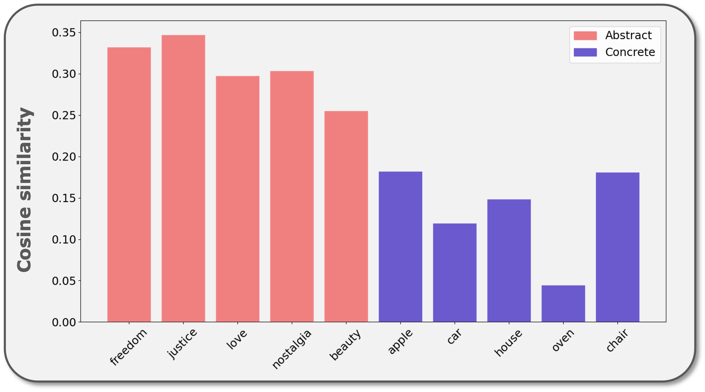 To answer the first question, we compare the cosine similarity of embeddings of concrete and abstract words between the ungrounded BERT-model and the visually grounded VG-BERT model. In this work, the concreteness of a word is defined as the degree to which its referent is a perceptible entity. Note that while cosine similarity can lead to misleading results when comparing different models (due to the representational spaces not necessarily aligning), it can be used here since VG-BERT uses the pretrained BERT as its main backbone and is simply fine-tuned with additional visual data. As can be seen in the plot above, the visually grounded embeddings of abstract words (freedom, justice, love, etc.) show a higher cosine similarity to their ungrounded counterpart embeddings compared to the embeddings of concrete words (apple, car house, etc.), which means that the visual grounding process affects the embeddings of conctete words more than the embeddings of abstract words. This result should come as little surprise, since while concrete words such as apple or car are very likely to be represented in an image-caption dataset such MS COCO, which was used to visually ground the BERT-embeddings (Zhang et al., 2021), whereas abstract words like freedom or justice are much harder to find unique visualizations for.